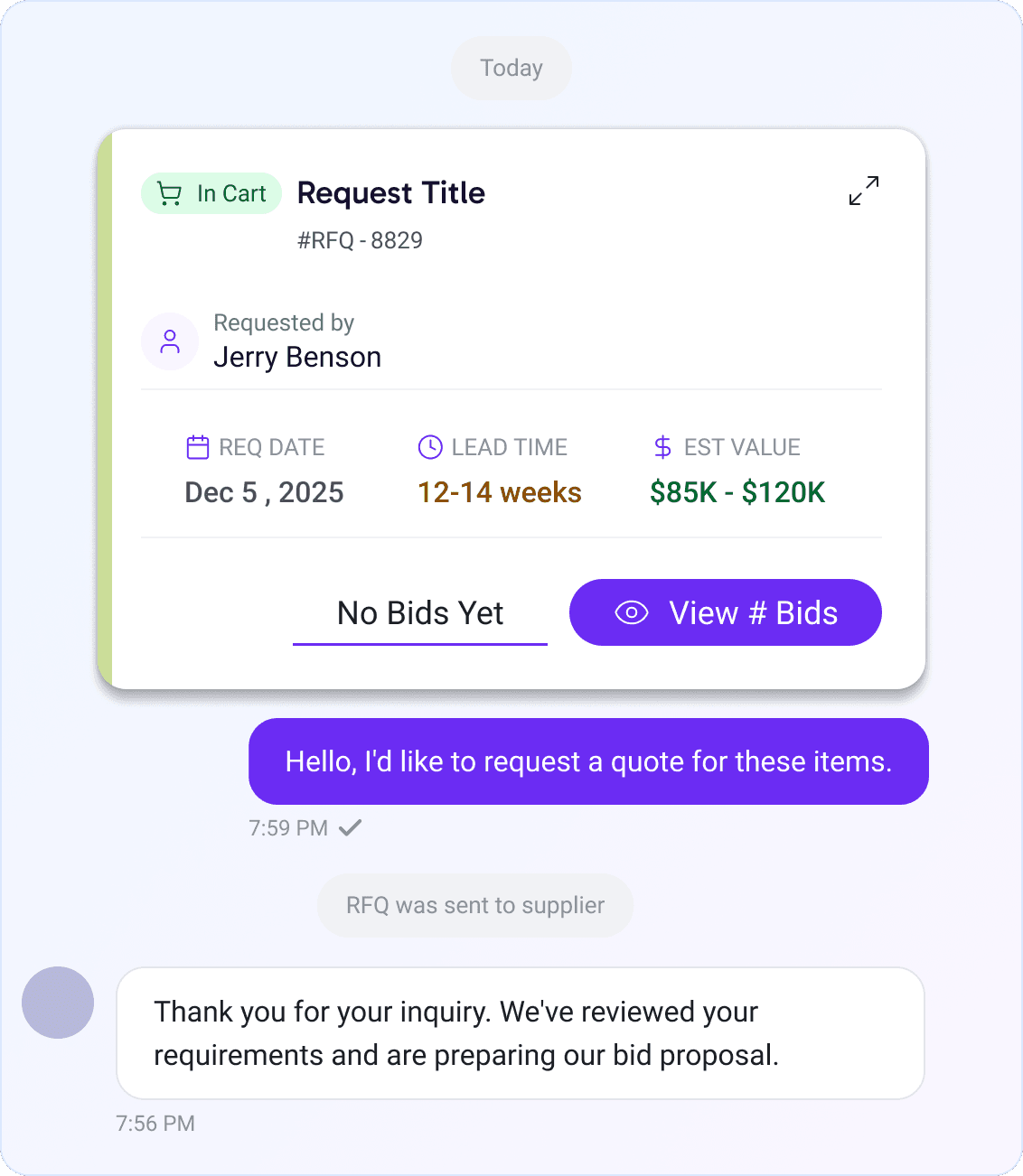 Suppliers respond directly in the platform with pricing and delivery terms.