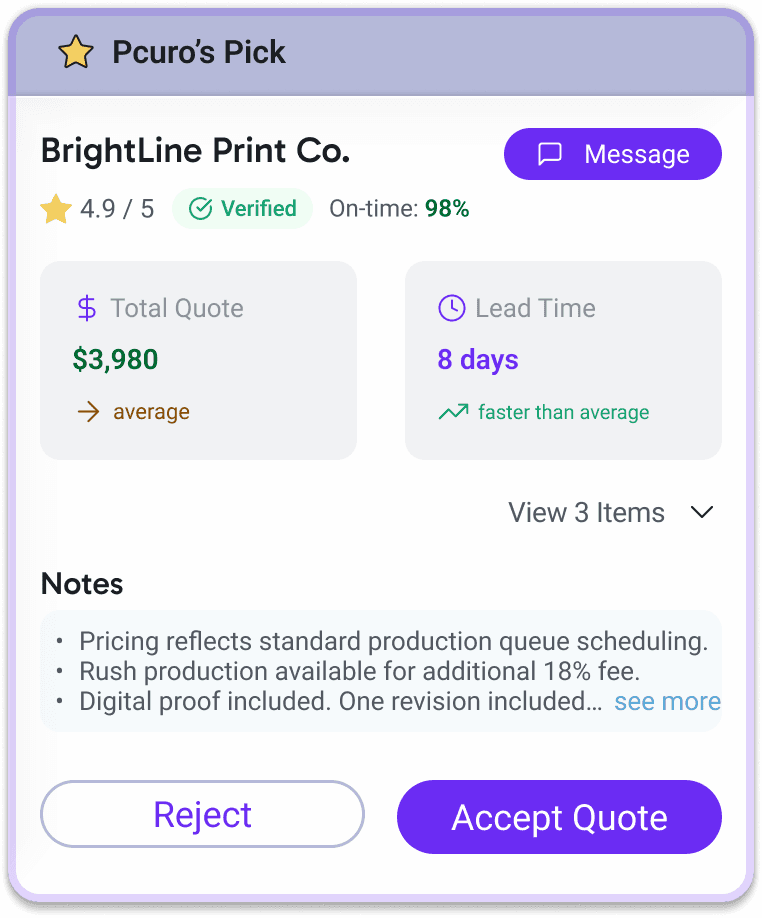 All supplier quotes are automatically organized so you can evaluate pricing, lead times, and supplier reliability in one place.